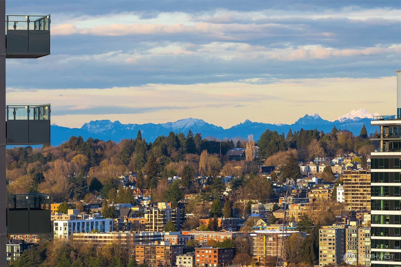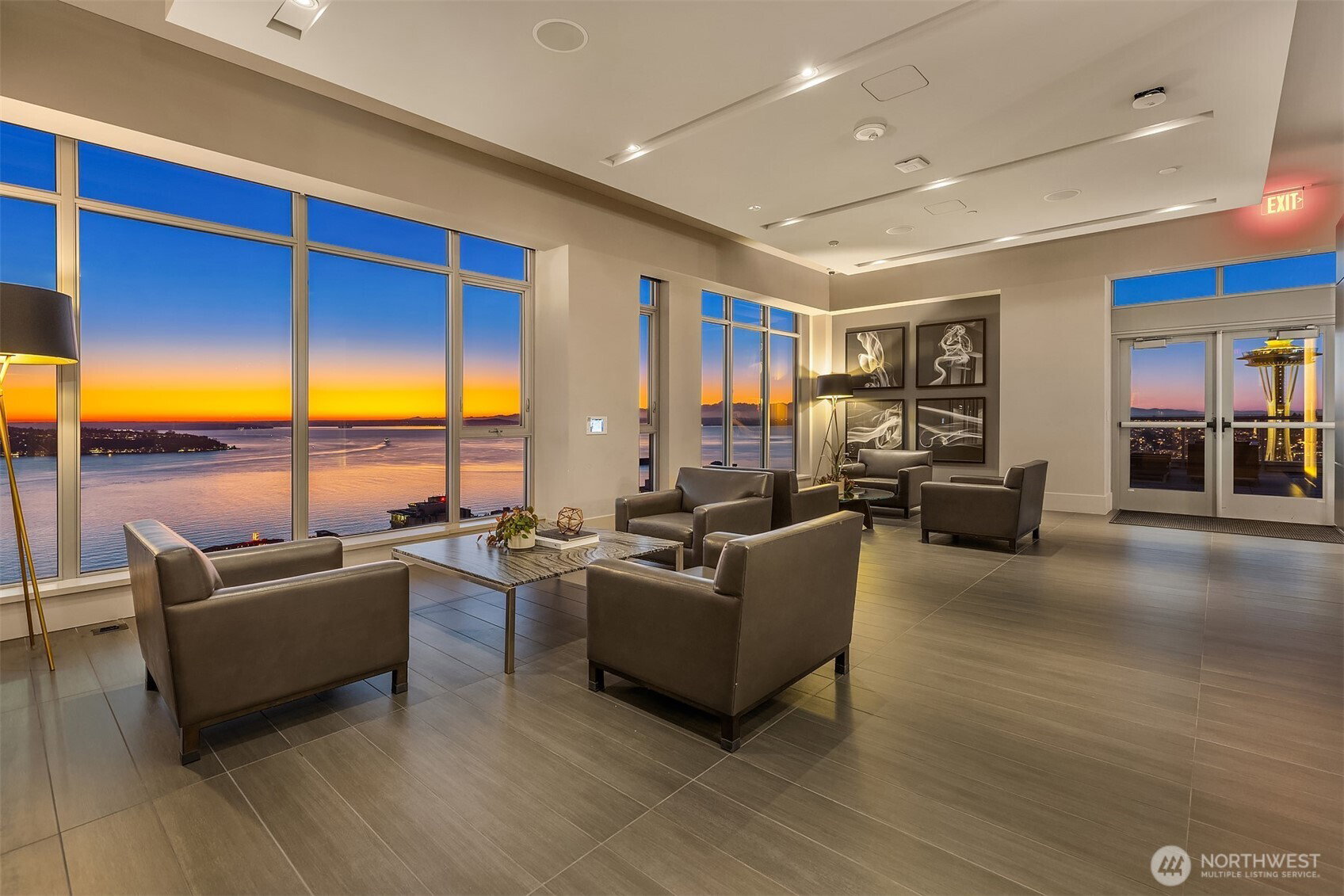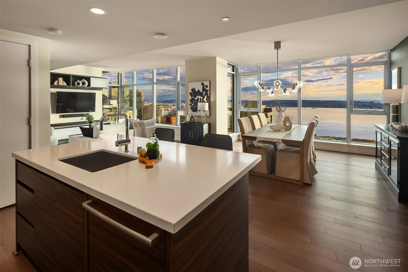 As one of the most sought-after floorplans in the building, this rare 34th floor SW corner 2BD+Den is perched above the city with panoramic views of Elliott Bay, the Olympic Mountains, and the skyline. Walls of glass capture ever-changing skies and weather systems rolling in from the west, bringing movement and depth to the view in every season. Expansive yet comfortable interiors open to a large, covered balcony that extends the living space for year-round use. The kitchen anchors the space with sleek European cabinetry, quartz countertops, chic subway-tiled backsplash, and a premium appliance suite including a Bosch gas cooktop, a Thermador paneled refrigerator, and a cabinet-front dishwasher. The adjoining living/dining spaces create an effortless setting for both entertaining and everyday living, while the den offers flexibility for a home office, guest room, or additional lounge area. The generously sized BDs are thoughtfully separated for privacy, offering custom closets, with a convenient Murphy bed/desk built-in in the guest rm. The spa-inspired stone/marble bathrooms are lovely, but the view of the sunsets from the guest shower, priceless. Designer light fixtures, media center, decorative wall coverings, motorized shades, A/C, and more. Insignia delivers a resort lifestyle with 24-hour concierge service, two-story fitness center w/pool, a screening room, 7th-floor park, 41st-floor rooftop lounges, dog run, and much more! 2 premium parking spaces / 1 storage included.