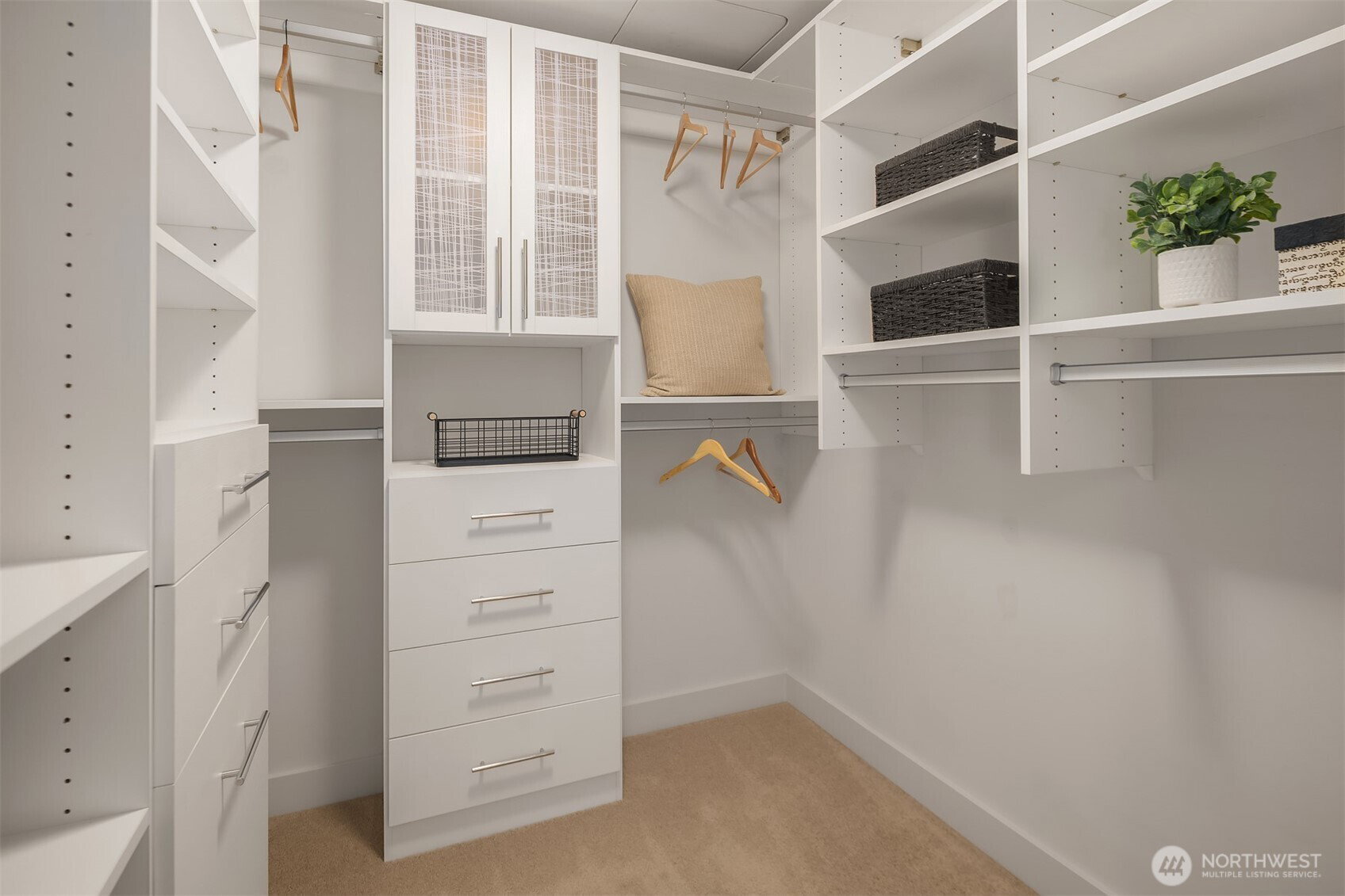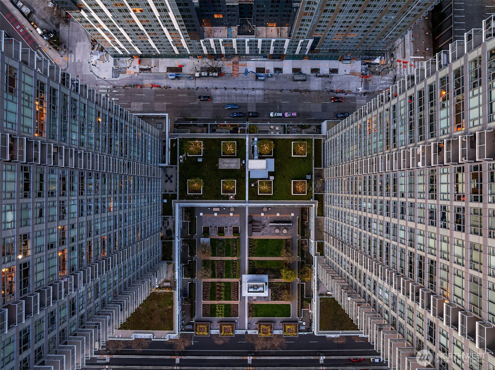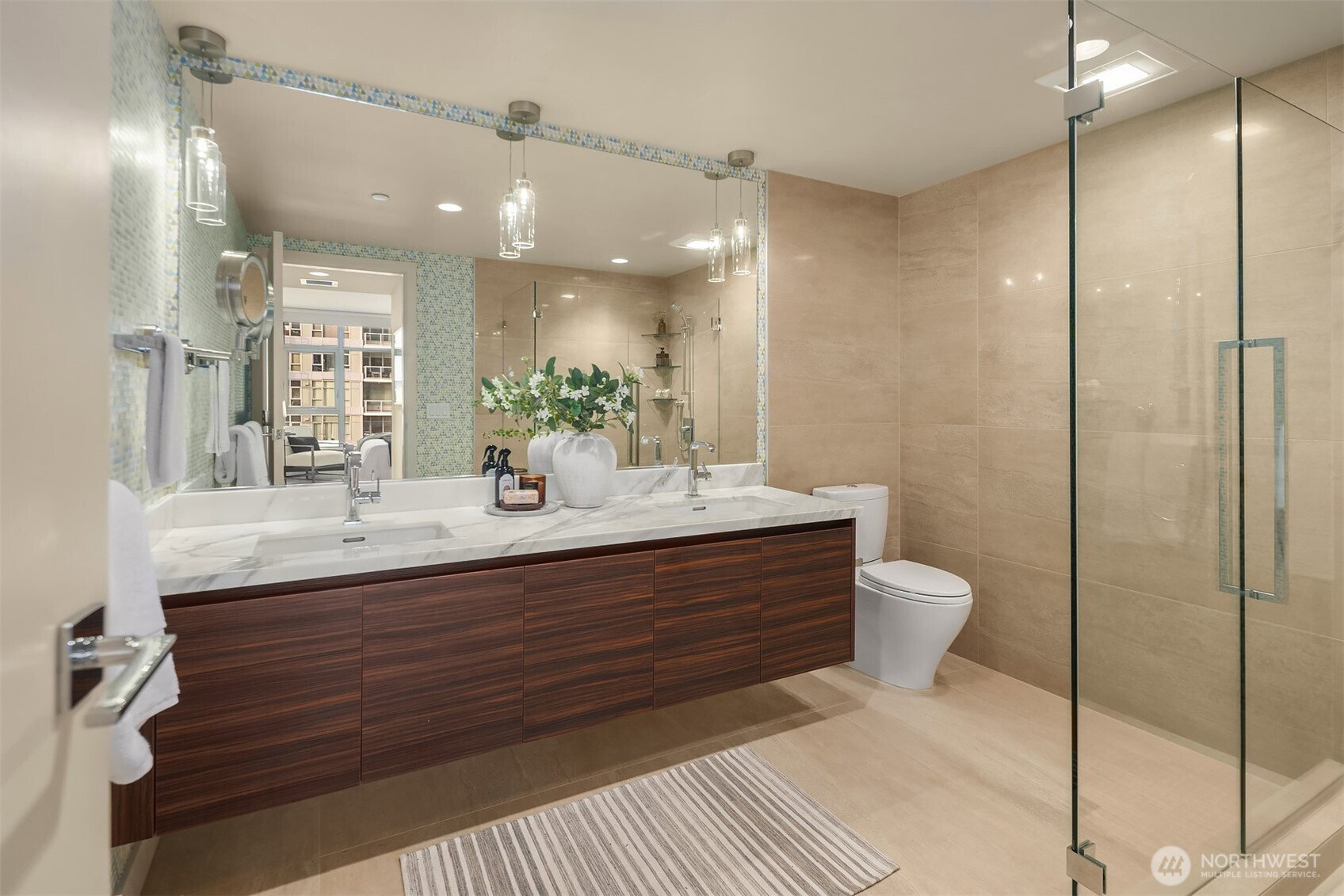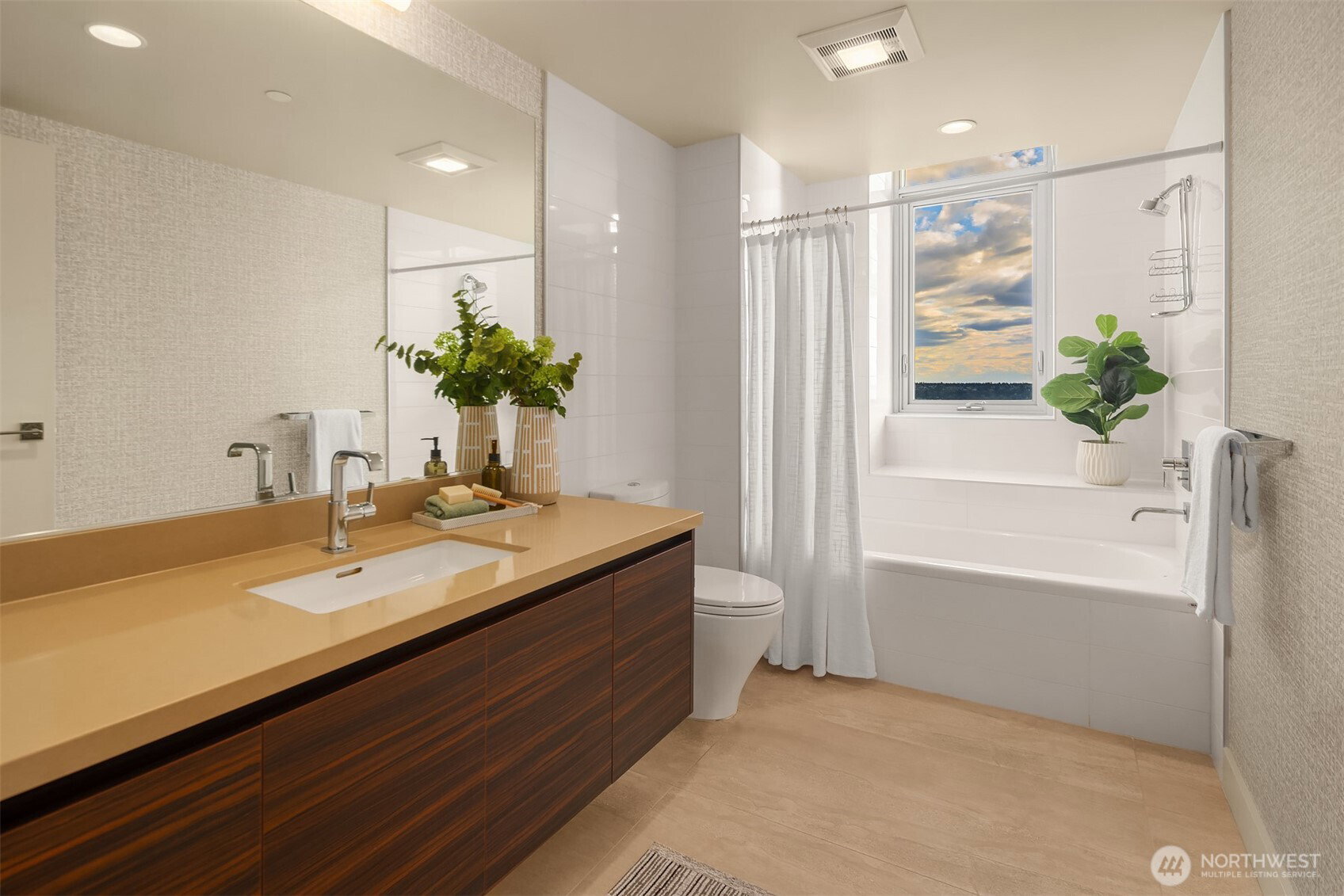 As one of the most sought-after floorplans in the building, this rare 34th floor SW corner 2BD+Den is perched above the city with panoramic views of Elliott Bay, the Olympic Mountains, and the skyline. Walls of glass capture ever-changing skies and weather systems rolling in from the west, bringing movement and depth to the view in every season. Expansive yet comfortable interiors open to a large, covered balcony that extends the living space for year-round use. The kitchen anchors the space with sleek European cabinetry, quartz countertops, chic subway-tiled backsplash, and a premium appliance suite including a Bosch gas cooktop, a Thermador paneled refrigerator, and a cabinet-front dishwasher. The adjoining living/dining spaces create an effortless setting for both entertaining and everyday living, while the den offers flexibility for a home office, guest room, or additional lounge area. The generously sized BDs are thoughtfully separated for privacy, offering custom closets, with a convenient Murphy bed/desk built-in in the guest rm. The spa-inspired stone/marble bathrooms are lovely, but the view of the sunsets from the guest shower, priceless. Designer light fixtures, media center, decorative wall coverings, motorized shades, A/C, and more. Insignia delivers a resort lifestyle with 24-hour concierge service, two-story fitness center w/pool, a screening room, 7th-floor park, 41st-floor rooftop lounges, dog run, and much more! 2 premium parking spaces / 1 storage included.
